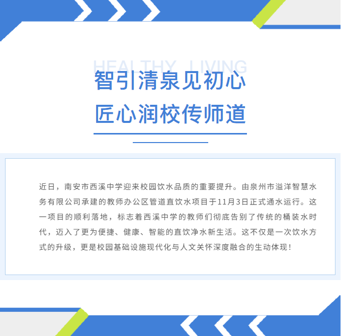 一股清泉,不仅告别了过往的繁琐,更流淌出校园人文关怀的温度。西溪中学此次引入管道直饮水,正是以细致入微的务实举措,改善教师工作环境,提升职业幸福感。这看似平常的改变,实则关乎每一位教师的健康与日常,是以实际行动践行尊师重教,赋能教育高质量发展。此次项目的成功,是泉州市溢洋智慧水务有限公司“以智慧清水,以诚服务”理念的生动实践。未来,溢洋智慧水务将继续秉承这份责任与匠心,将更安全、便捷、智慧的饮水体验带入更多领域,让清泉长流,不止于校园,更润泽我们共同的美好未来。