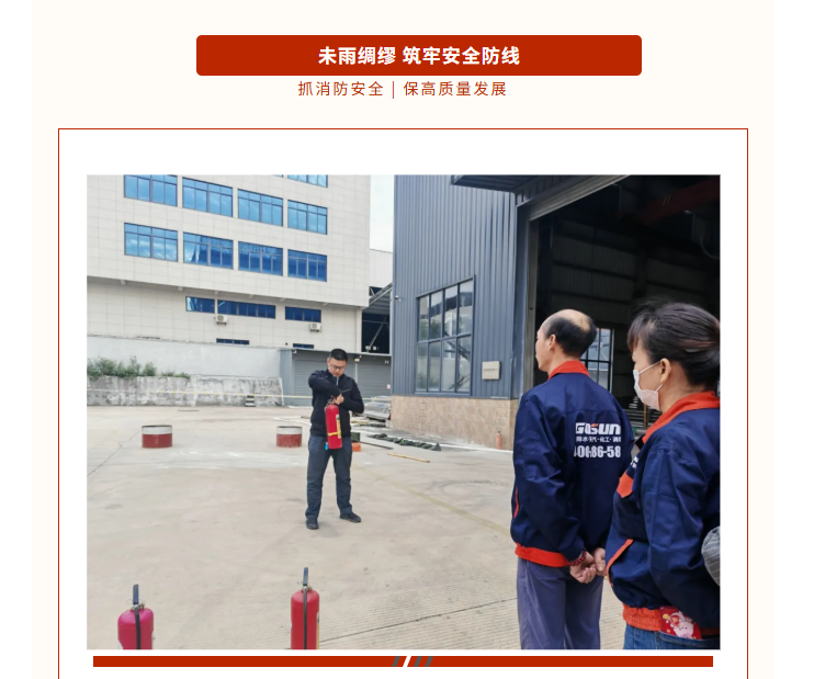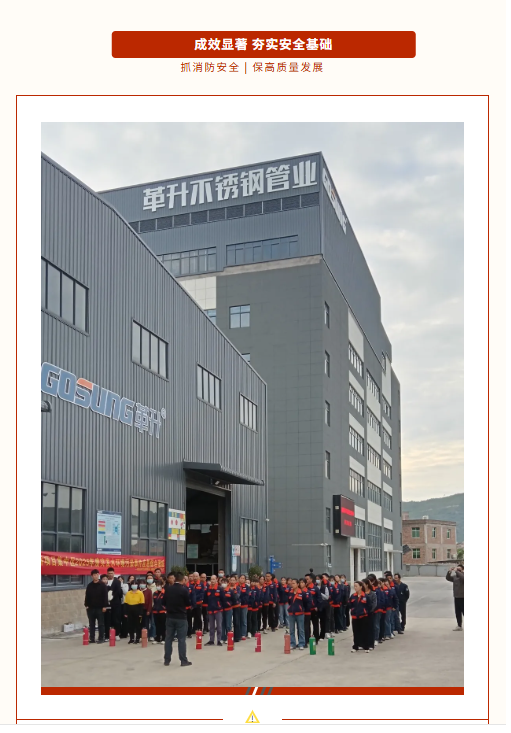 消防安全是企业发展的生命线。GOSUNG始终坚持"预防为主,防消结合"方针,于2025年11月19日下午在管材车间1号大门空地开展全员消防演练。演练前,GOSUNG制定了详细方案,明确各环节职责分工。全体员工统一穿着轻便运动鞋,严格遵守安全要求。此次演练不仅让员工掌握了消防器材使用方法和逃生技能,更为完善公司应急救援体系提供了实践依据。GOSUNG将持续夯实安全管理基础,为企业高质量发展筑牢安全屏障。