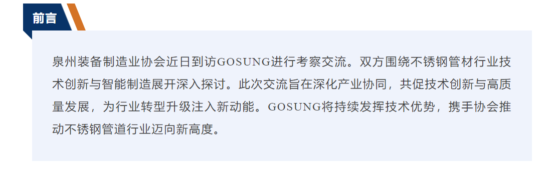 此次走访不仅加深了GOSUNG与泉州装备协会的互动,更为双方未来的合作奠定了坚实基础。GOSUNG将以此为契机,持续深化技术创新,加强与协会及行业伙伴的协作,共同推动管道行业的高质量发展,为“中国智造”贡献力量。未来,GOSUNG将继续秉持“专业、创新、共赢”的理念,与行业同仁携手,探索更广阔的发展空间!